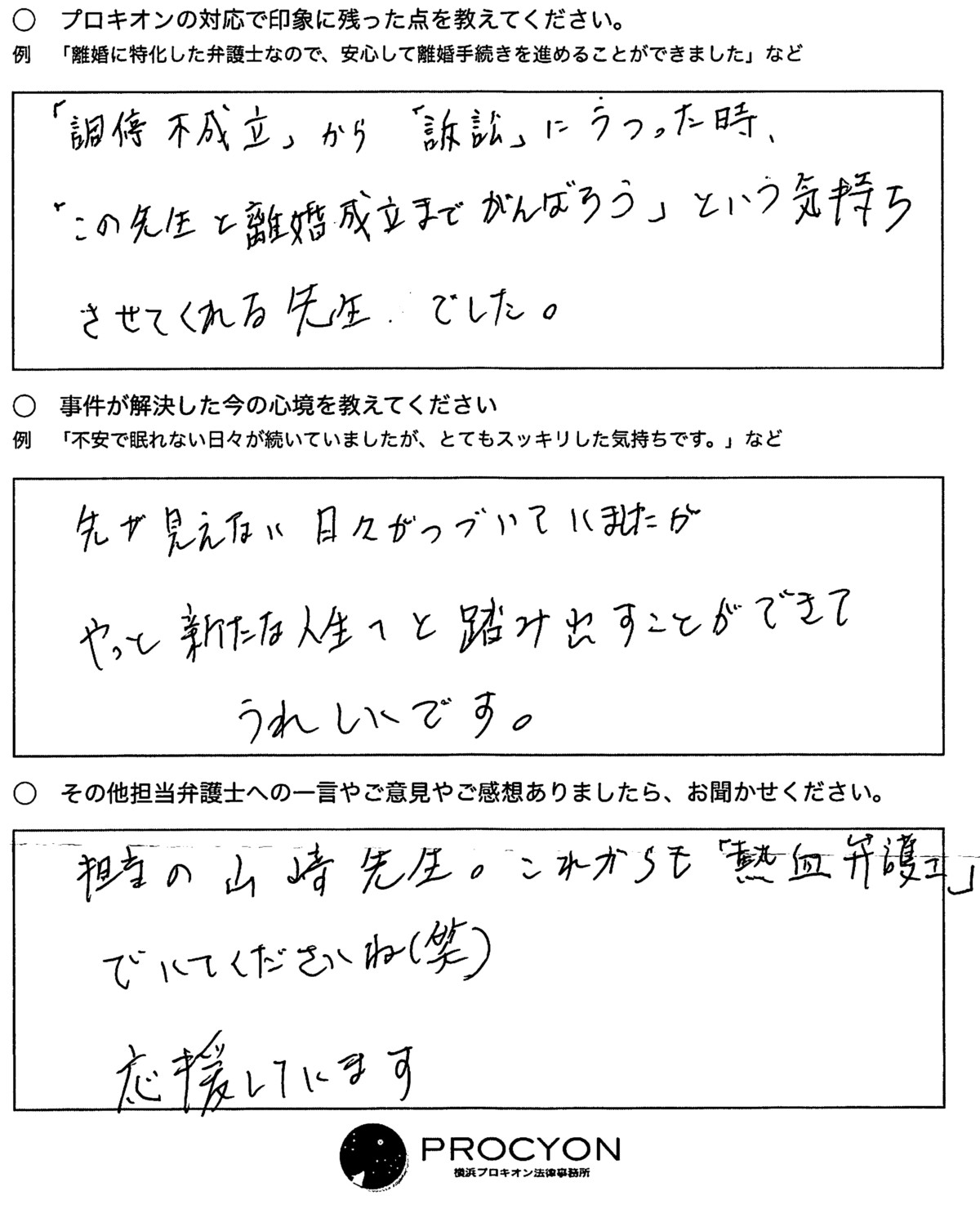 「調停不成立」から「訴訟」にうつった時、「この先生と離婚成立までがんばろう」という気持ちにさせてくれる先生でした。