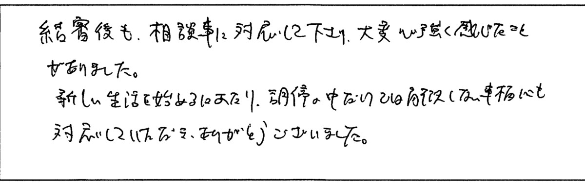 新しい生活を始めるにあたり、調停の中だけでは解決しない問題にも対応していただきありがとうございました。
