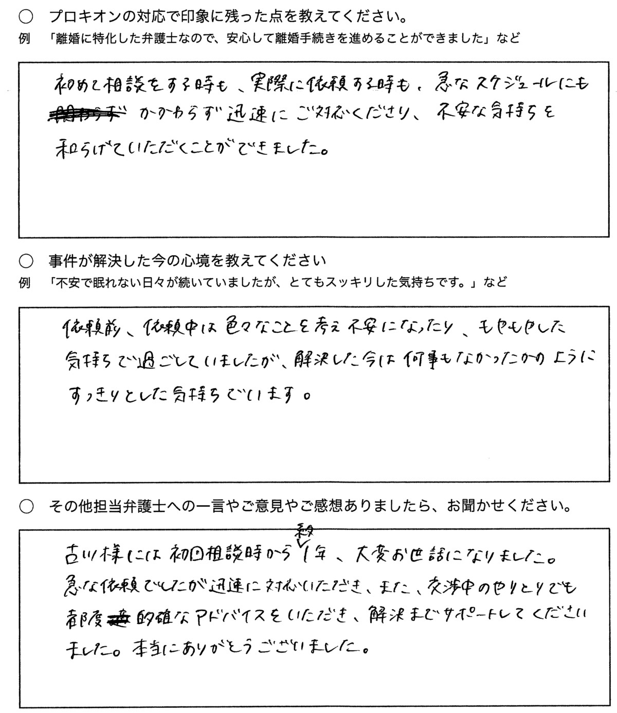 依頼前、依頼中は色々なことを考え不安になったり、もやもやした気持ちで過ごしていましたが、解決した今は何事もなかったかのようにすっきりした気持ちでいます。