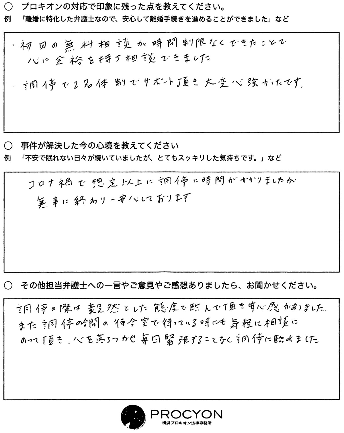 調停の際は毅然とした態度で臨んで頂き安心感がありました。また、調停の合間の待合室で待っている時にも気軽に相談に乗って頂き、心を落ち着かせ毎回緊張することなく調停に臨めました。