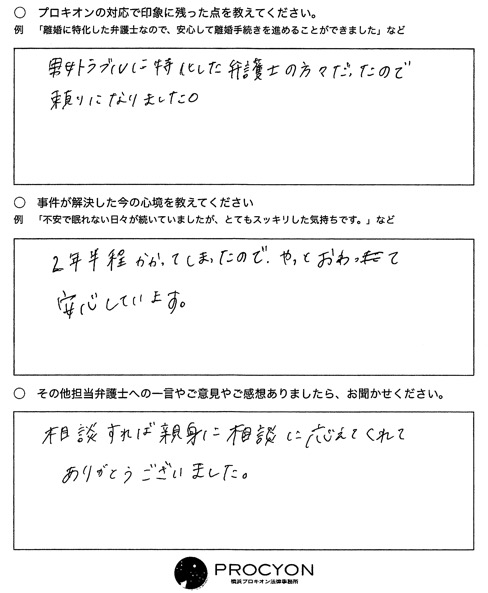 男女トラブルに特化した弁護士の方々だったので頼りになりました。
